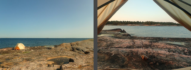 The last bit of paddling on Saturday was quite rough and choppy with some headwind, but we paddled with confidence and soon rounded the tricky southern head of Ornö and found a calm bay to pull into. The island rises steeply from this bay giving vast views from its cliffs, but the rock was fairly broken, making it hard to find a couple of flat-enough tent sites. After searching for a while, we found spots that were tentable—our spot provided good photos, even if it was pretty slopey. We shared our slice of jutting rock with an eagle who roosted in a tree just above our tents.
